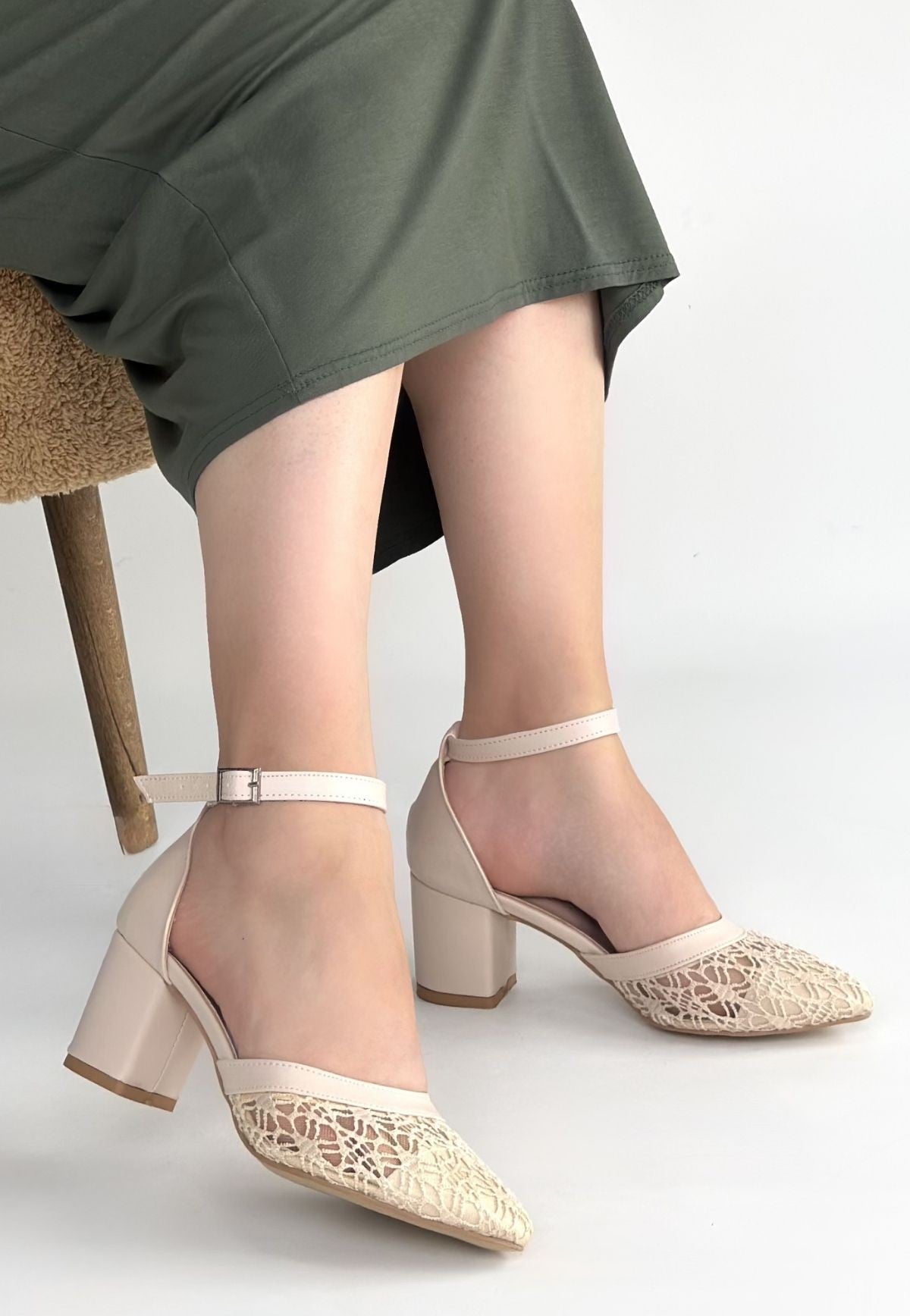 Kadın Bej Tül Detaylı Kısa Kalın Topuklu Ayakkabı - Dmop