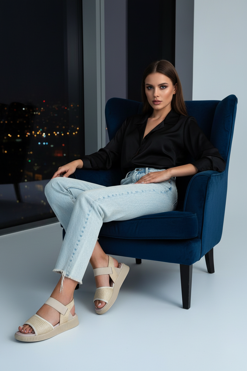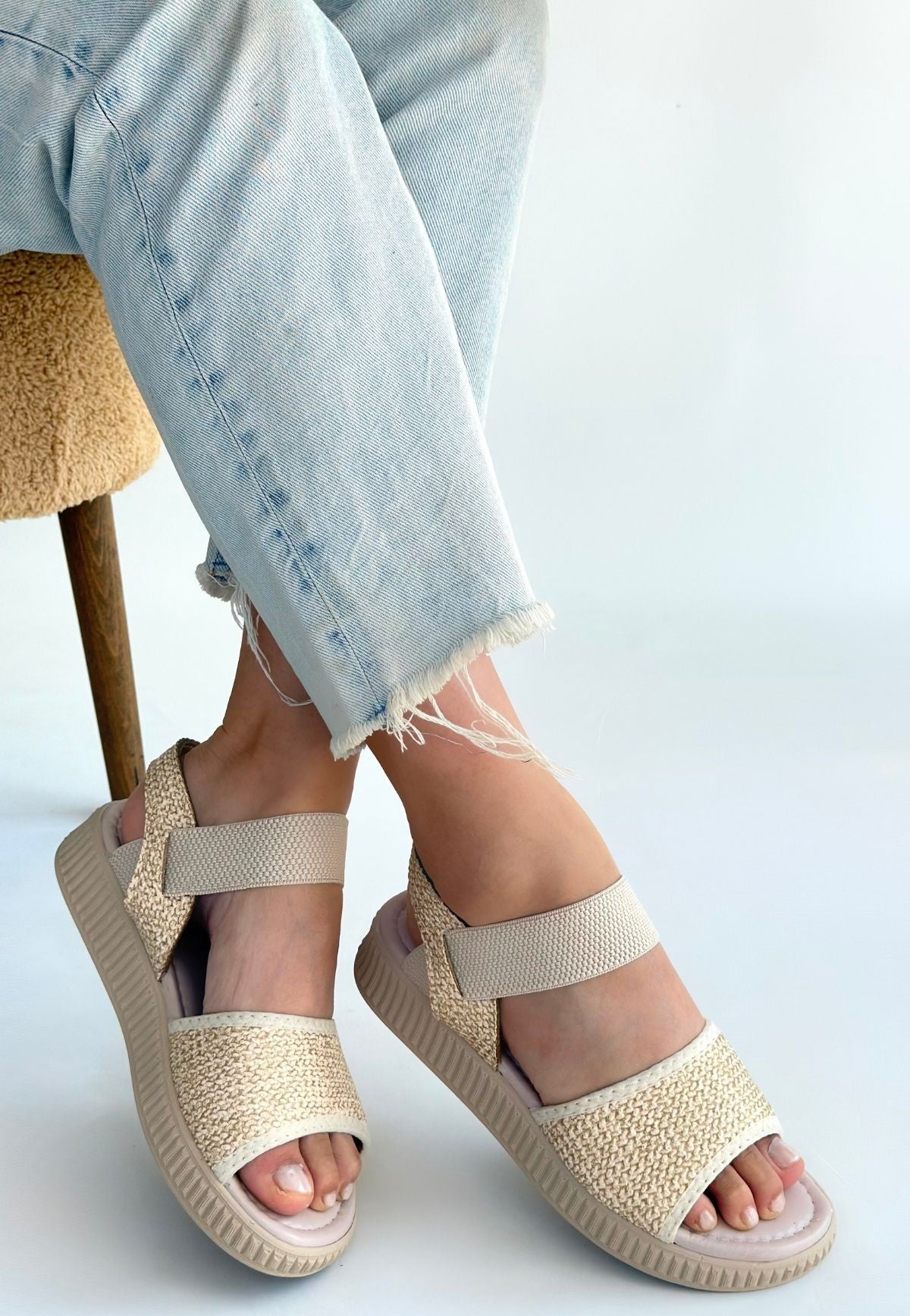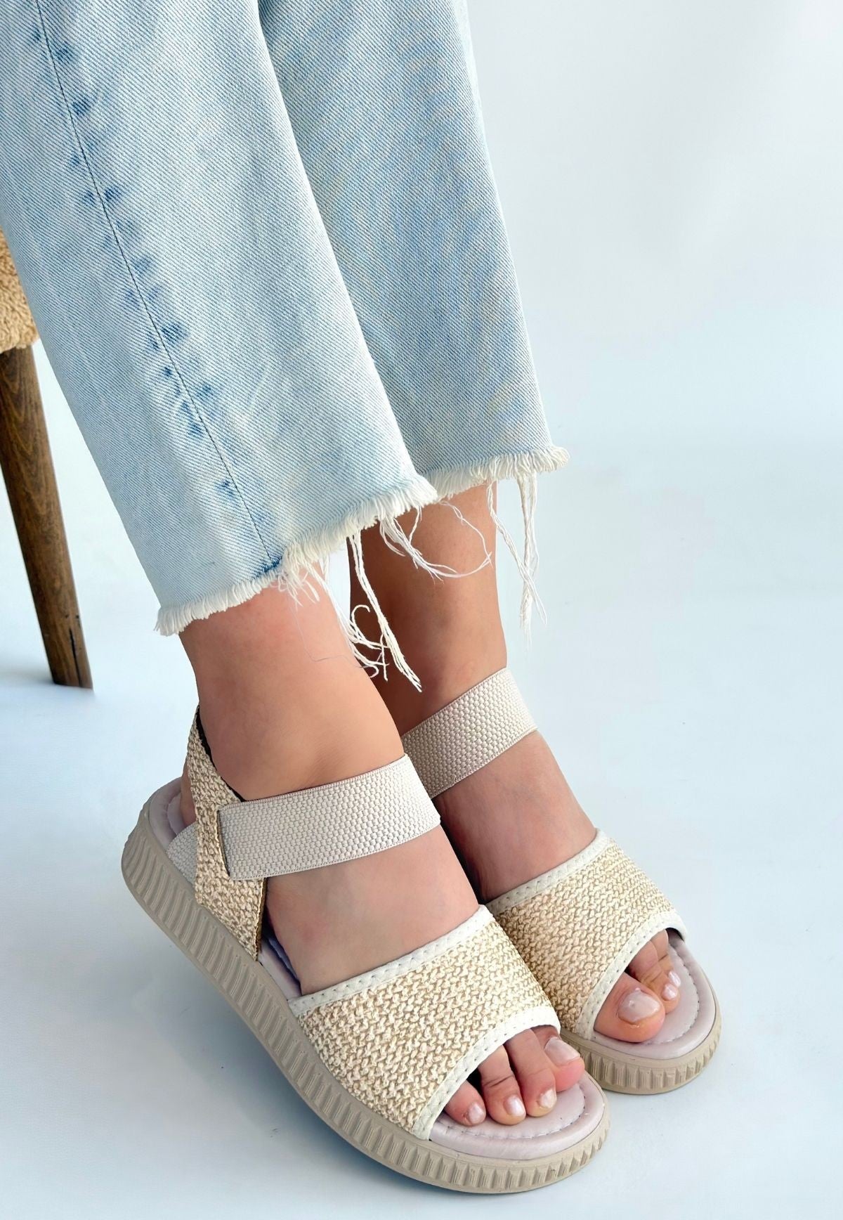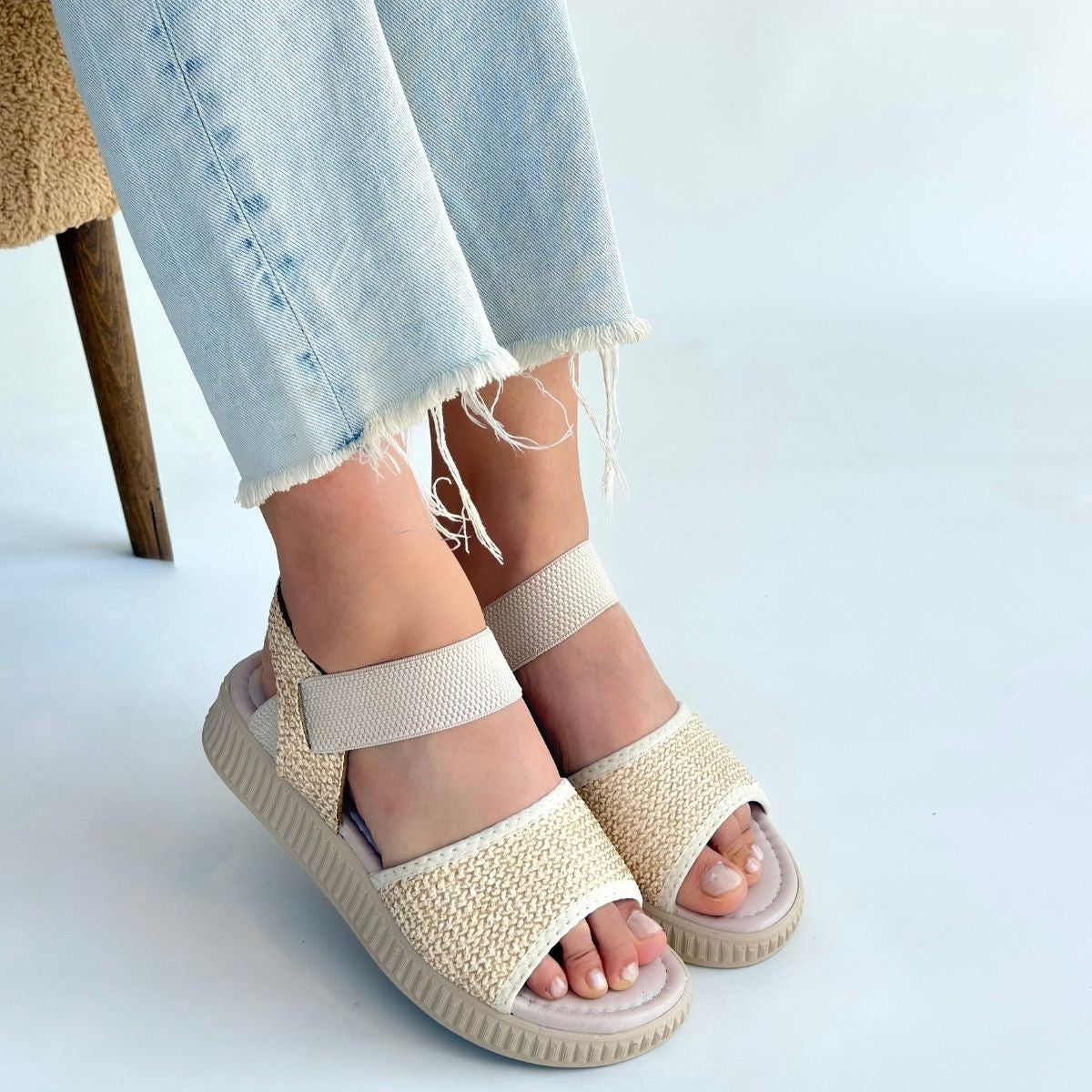 Kadın Bej Hasır Bilekten Lastikli Sandalet - Jake