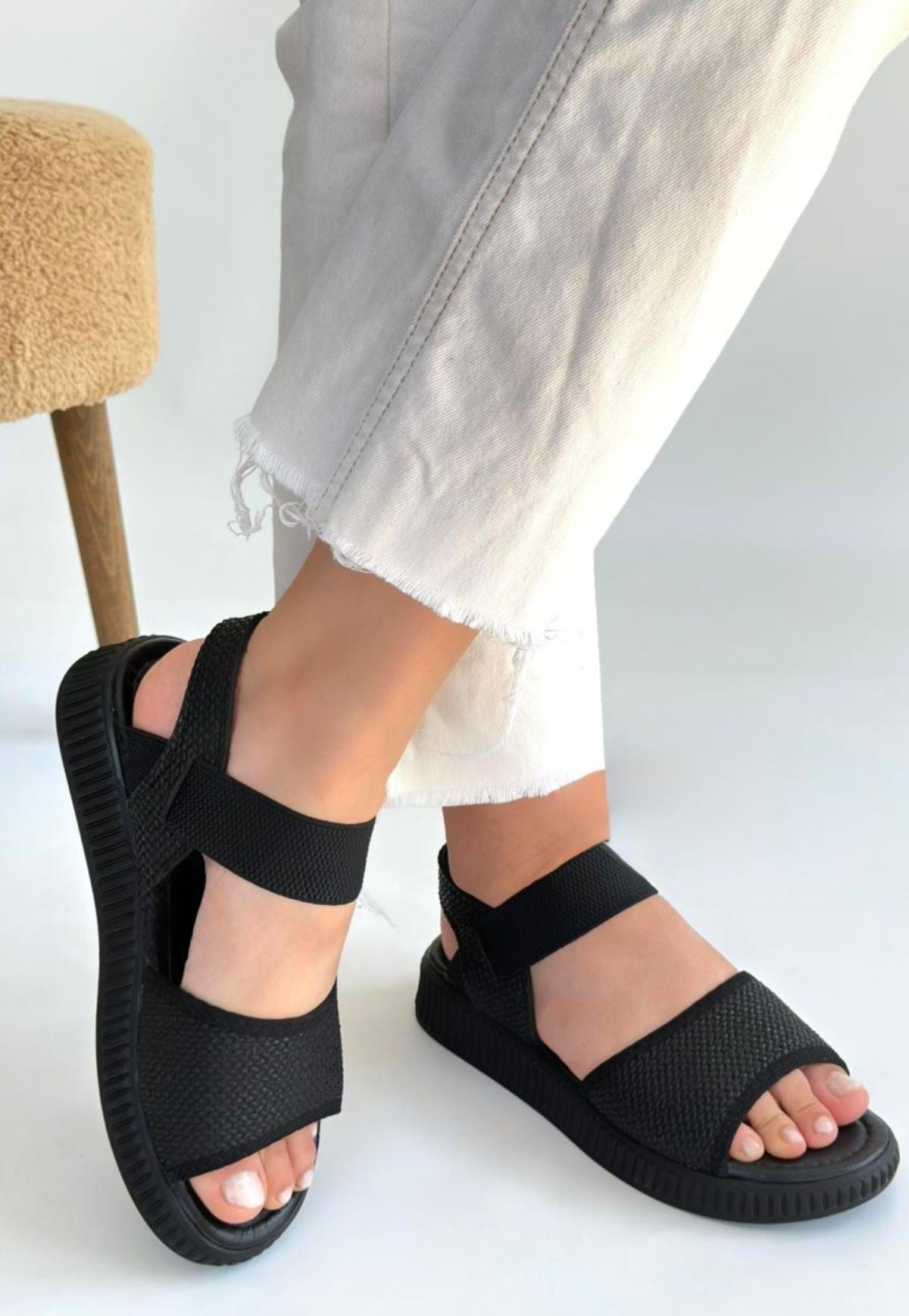 Kadın Siyah Hasır Bilekten Lastikli Sandalet - Jake