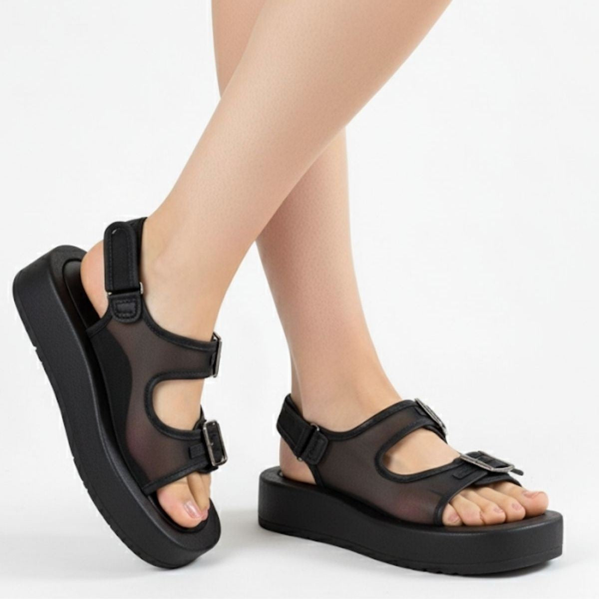 Kadın Siyah Tül Detaylı Cırt Cırtlı Sandalet - Sinna