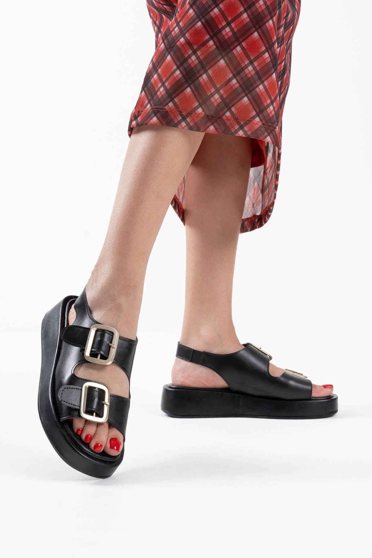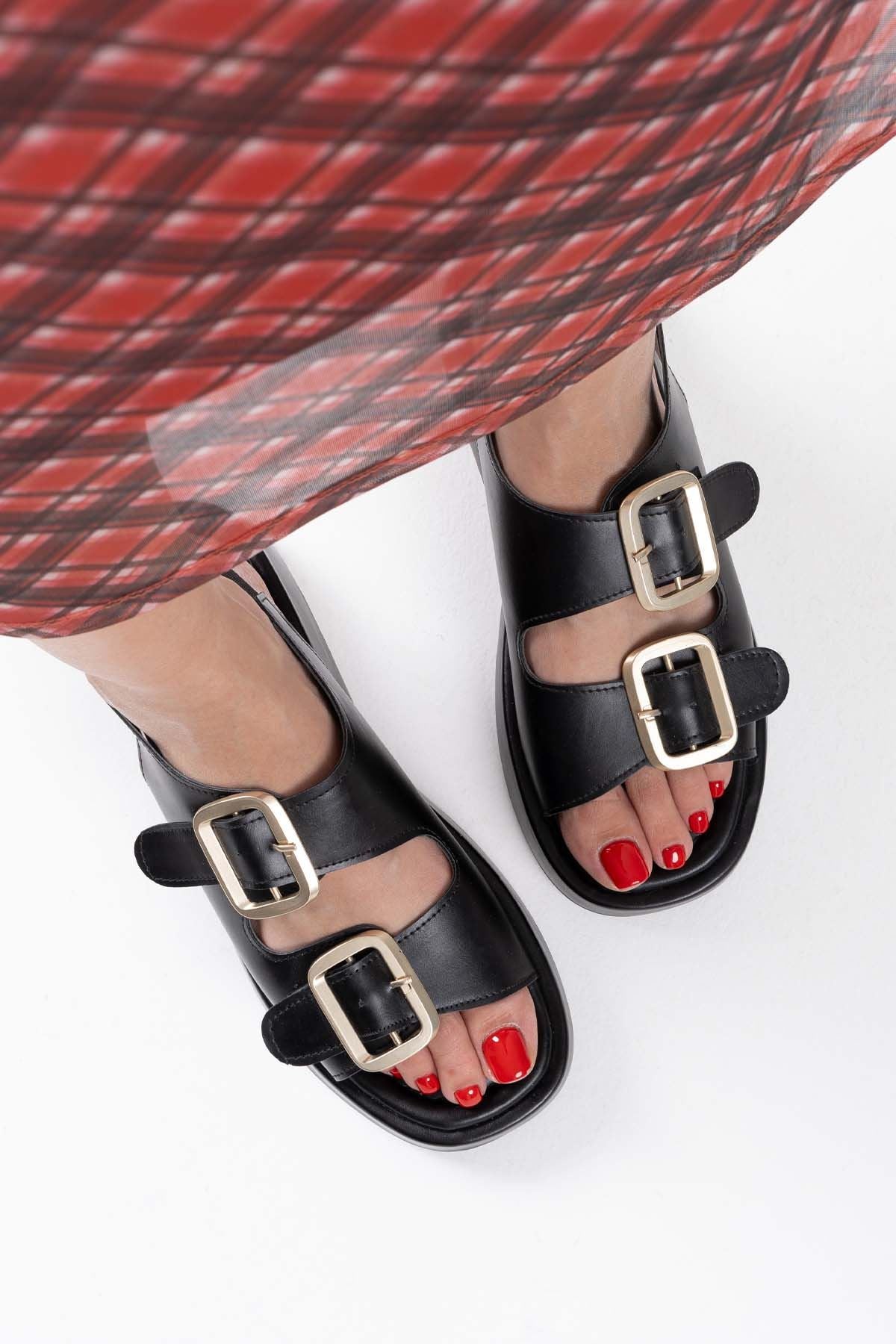 Shery Siyah Çift Bantlı Toka Detaylı Kadın Sandalet