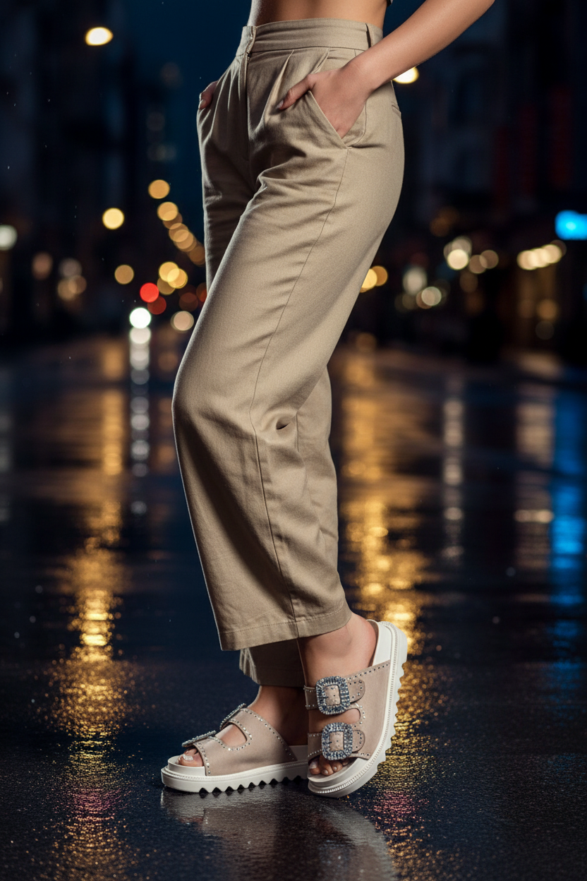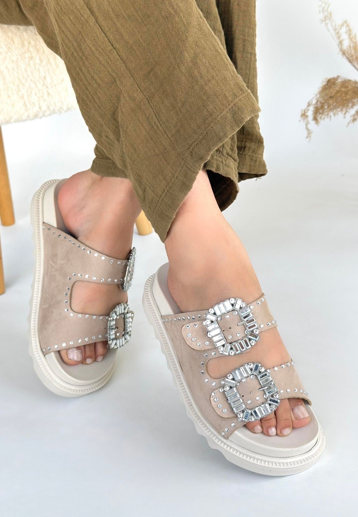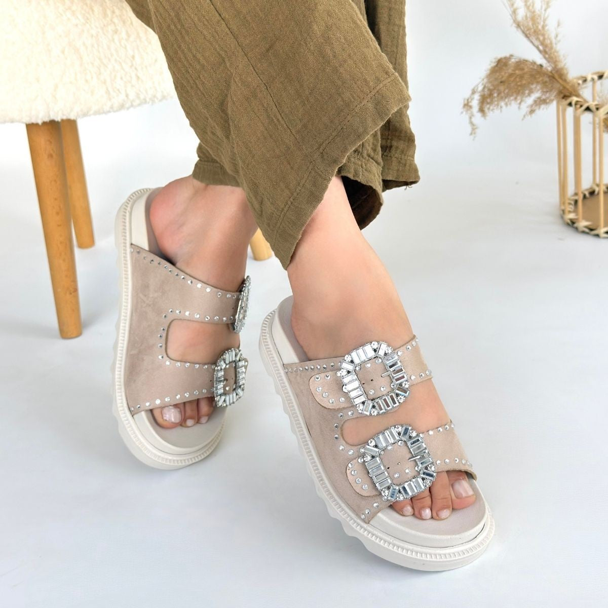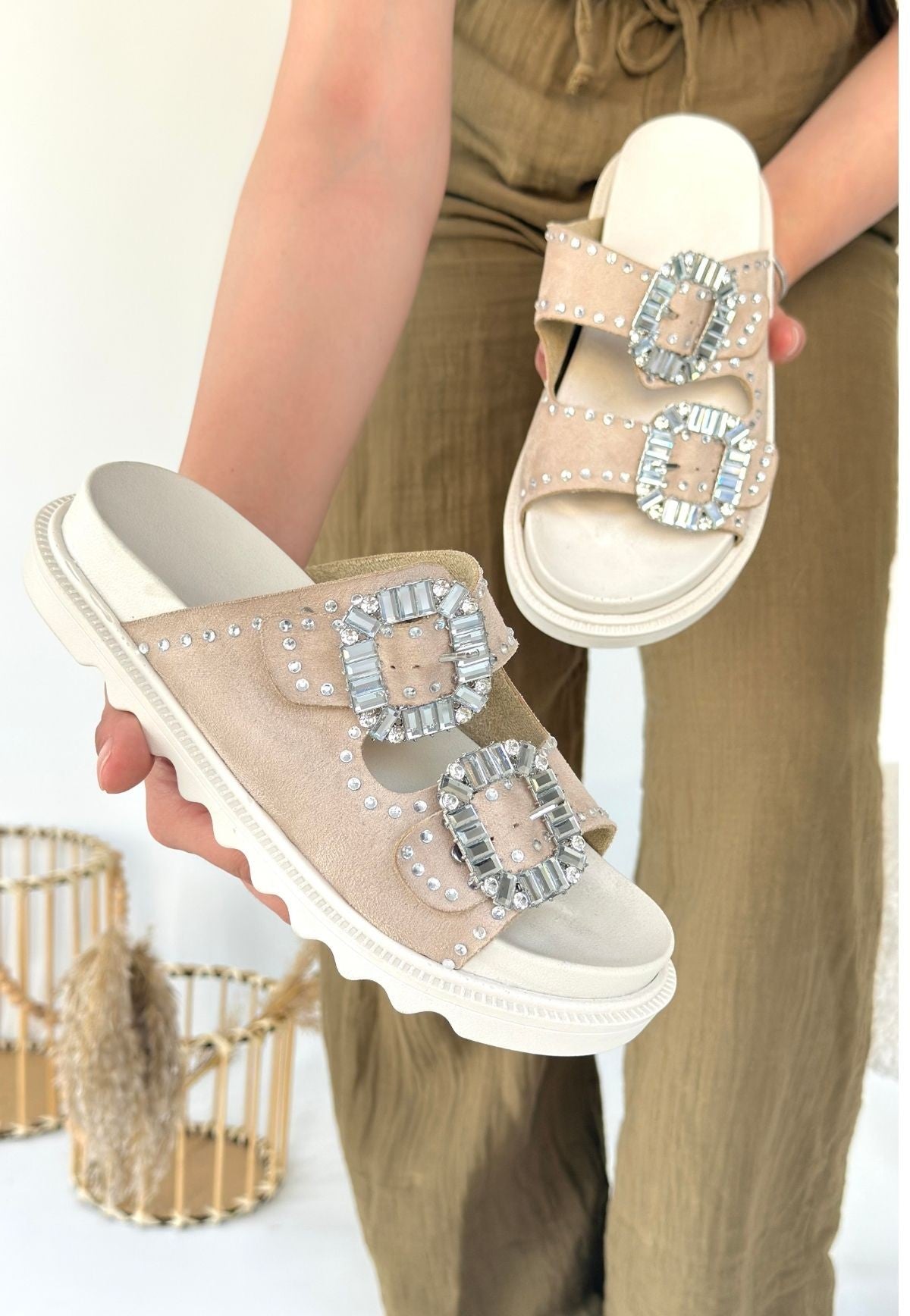 Kadın Bej Nubuk Taşlı Çift Toka Kemerli Terlik - Juana