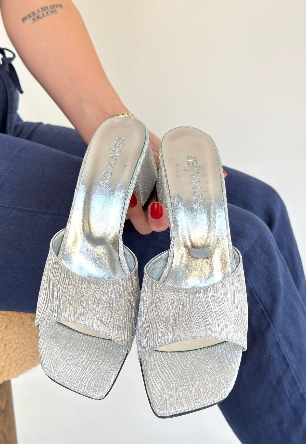 Kadın Gümüş Simli Kalın Topuklu Terlik - Luart