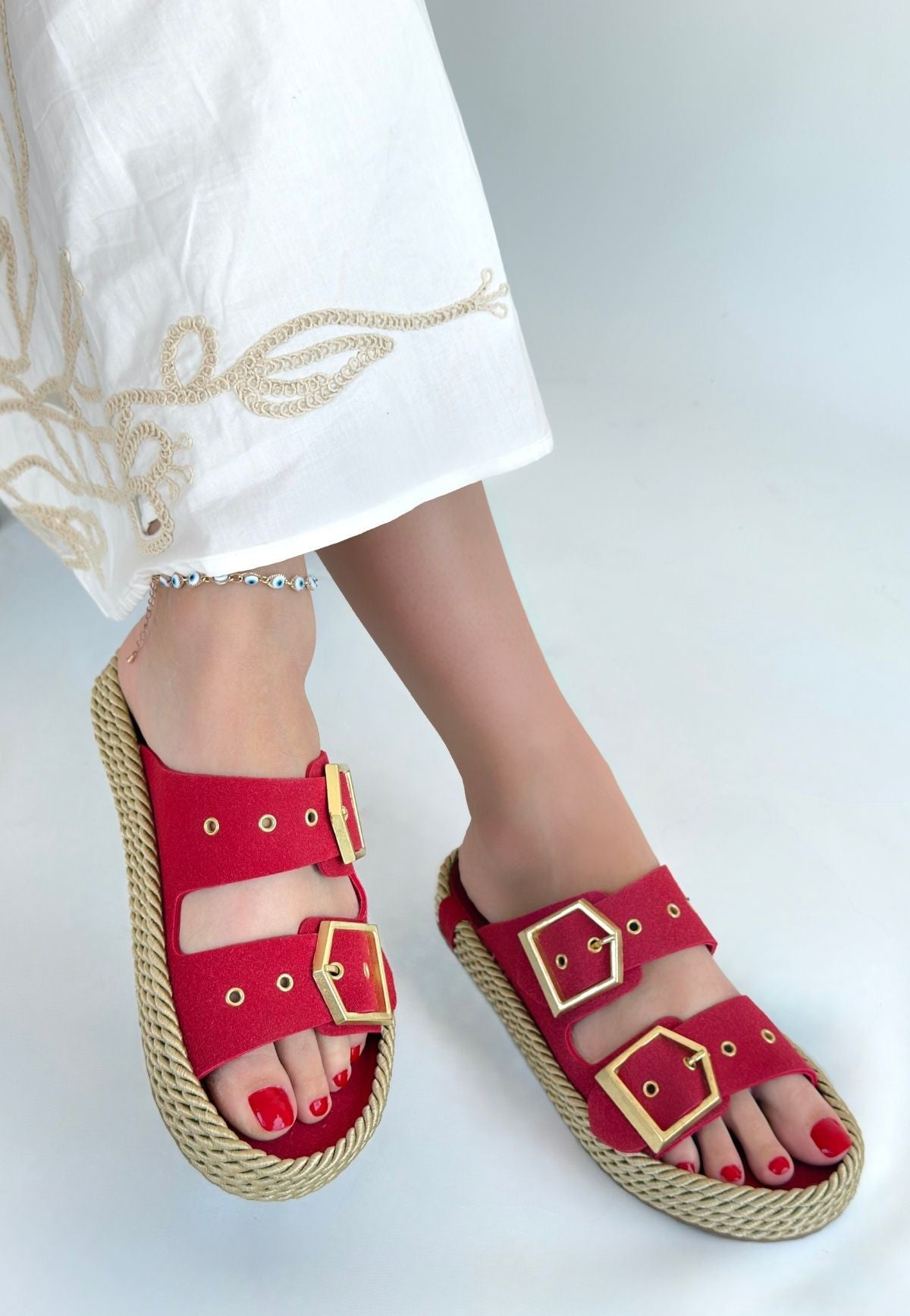 Kadın Kırmızı Nubuk Çift Kemerli Tokalı Terlik - İces