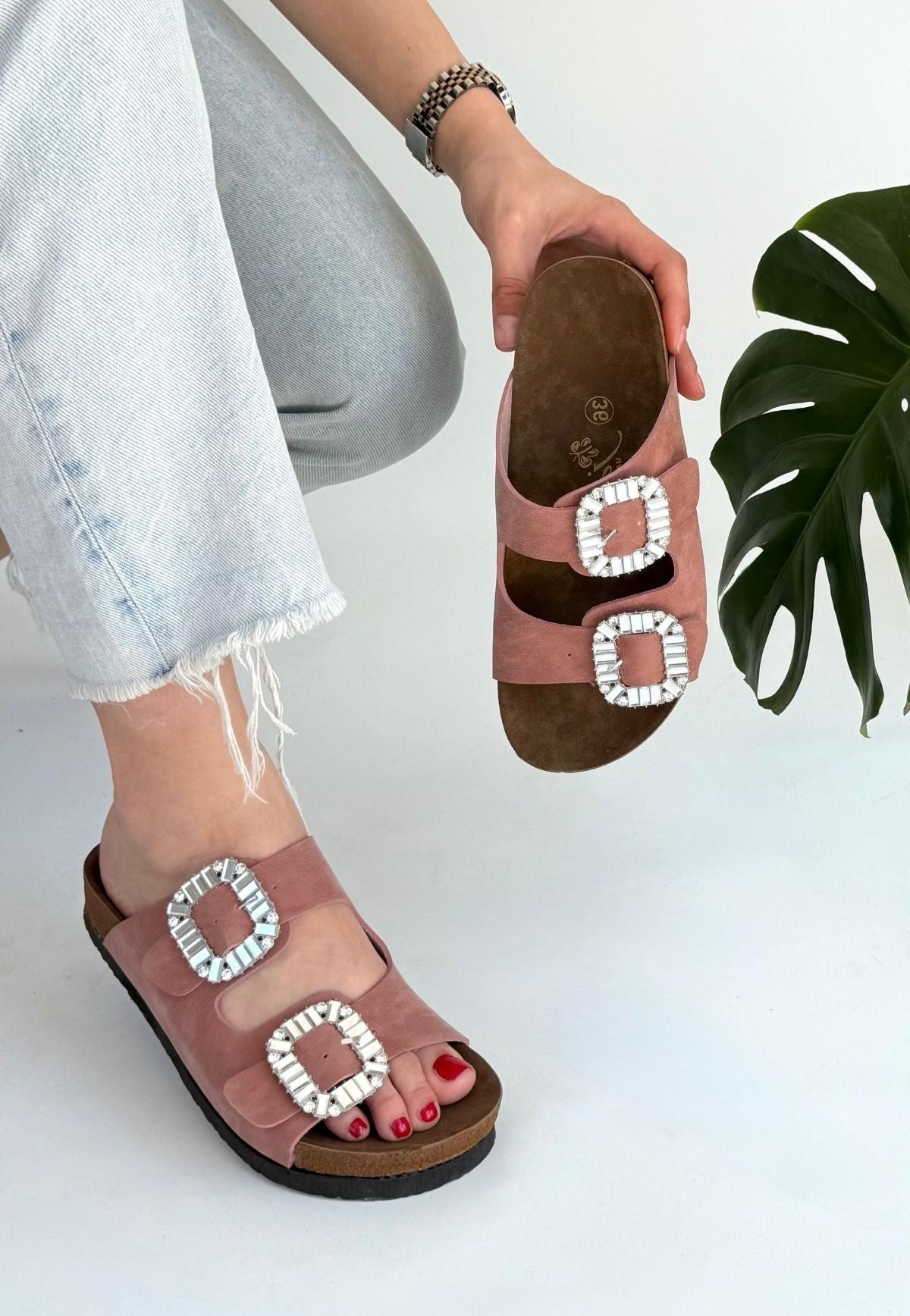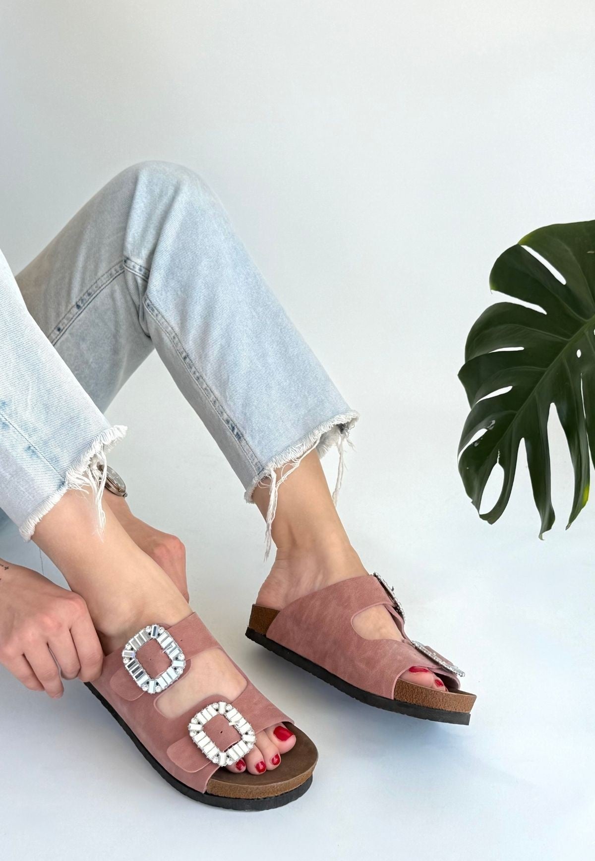 Kadın Pudra Nubuk Çift Bantlı Kemerli Terlik - Nool