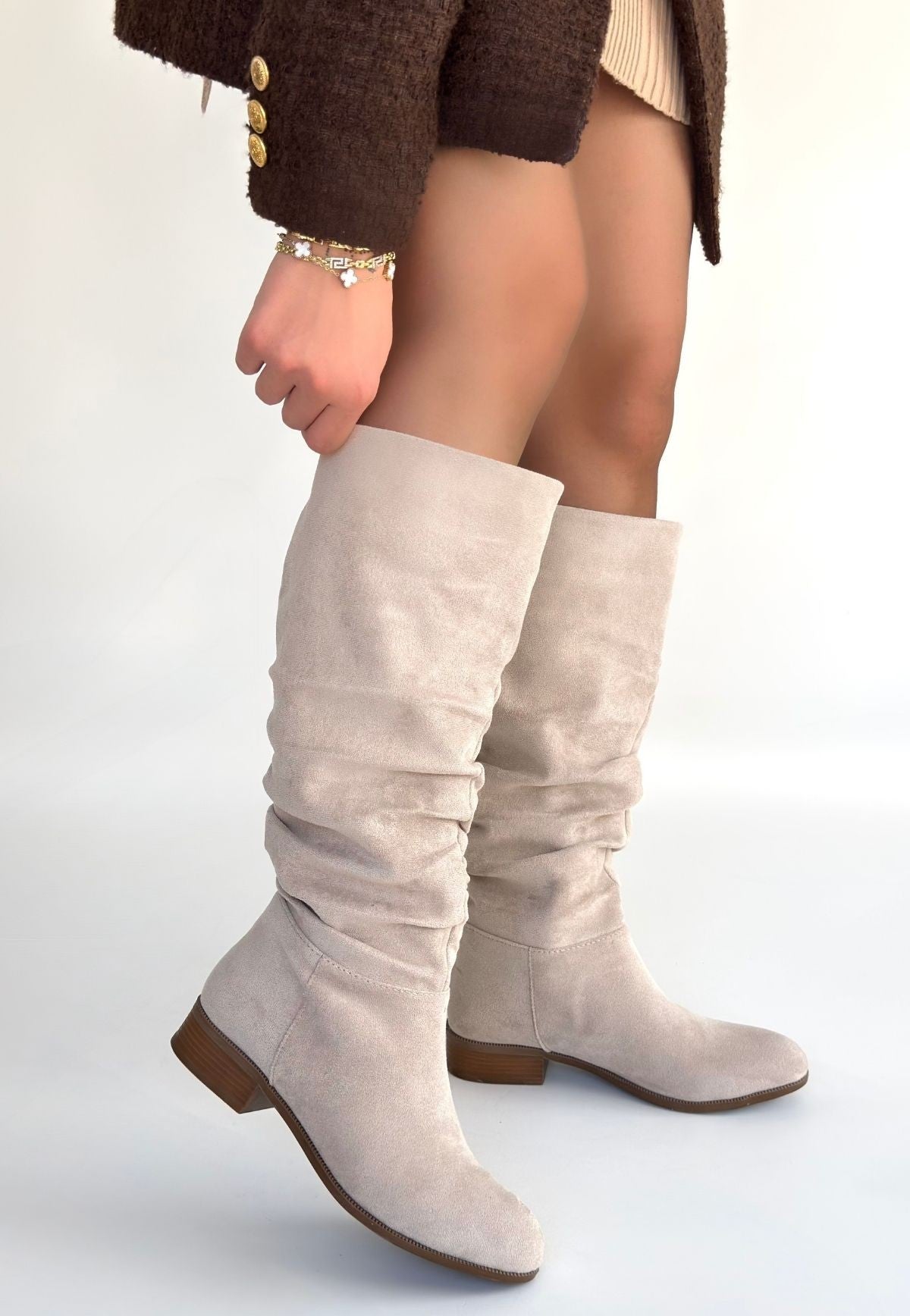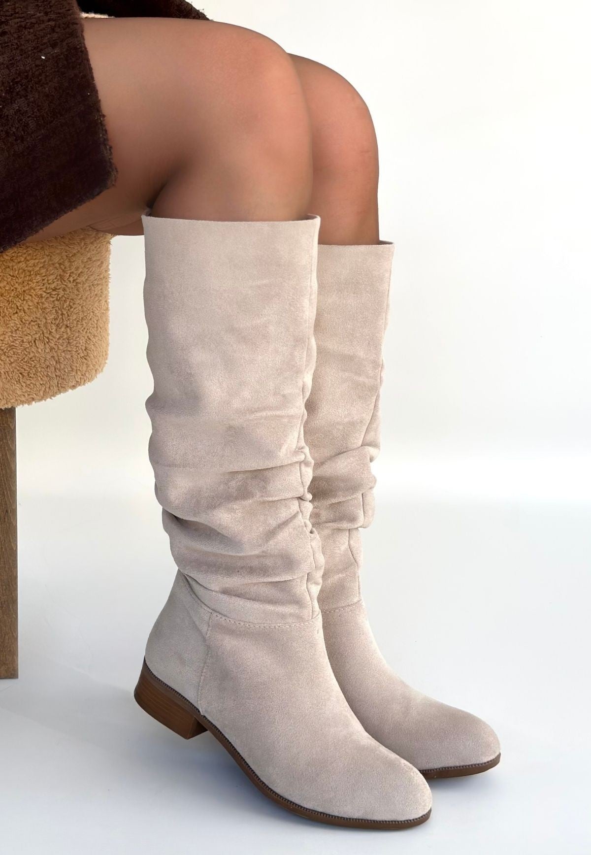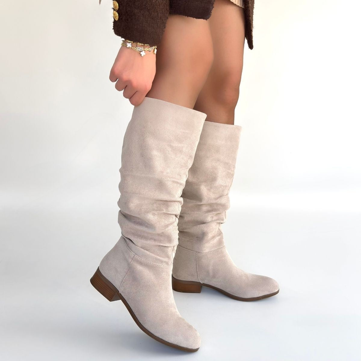 Kadın Bej Süet Kahverengi Tabanlı Körüklü Sivri Burun Kısa Topuklu Çizme - Winda