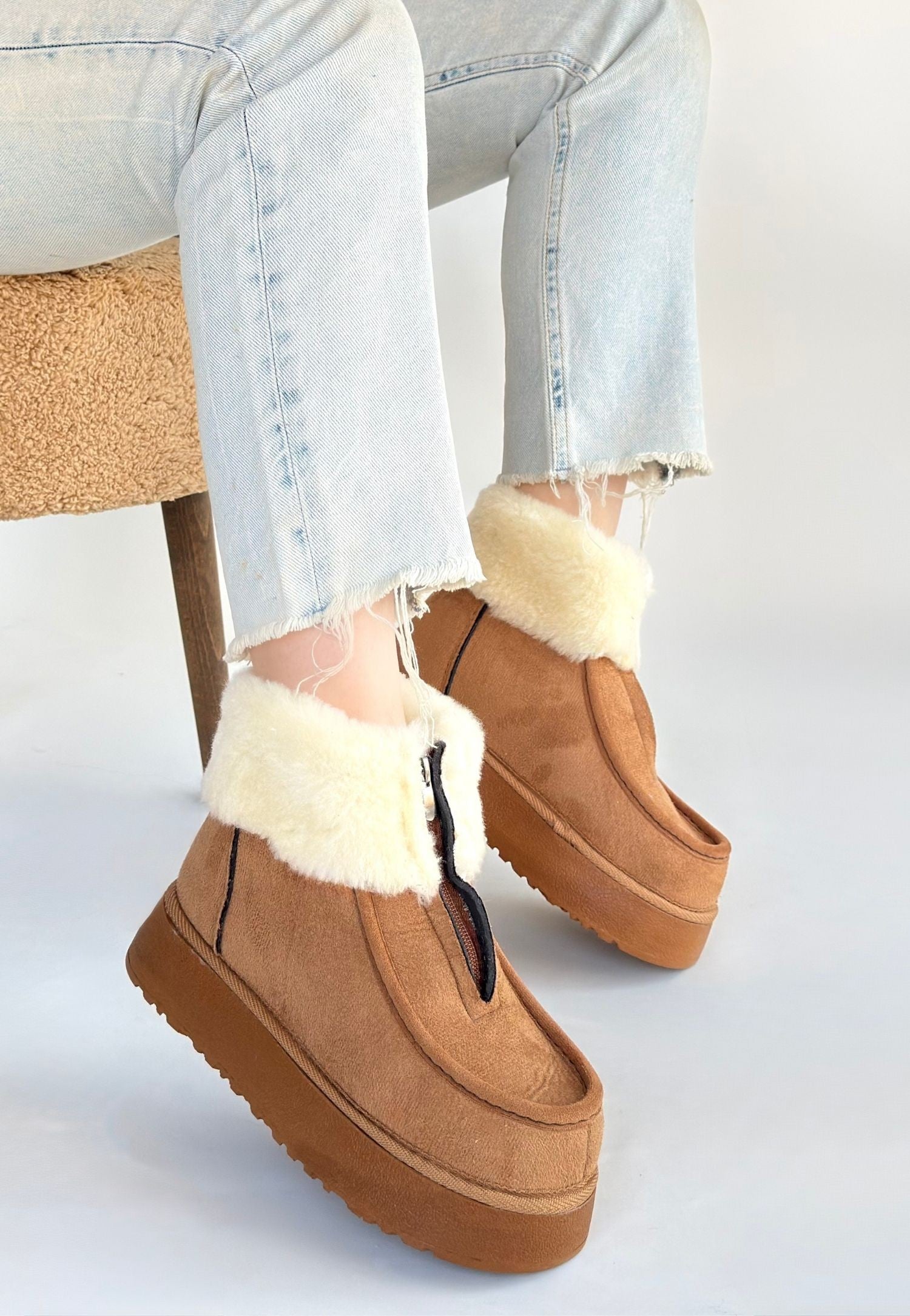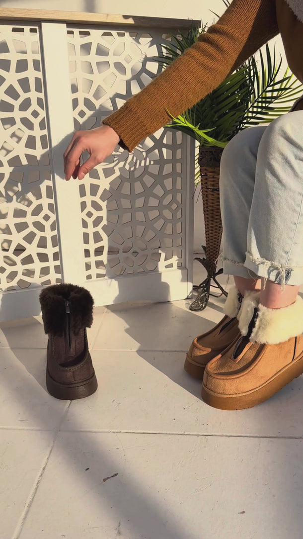 Kadın Taba Süet Önden Fermuarlı Bilekten ve İçi Kürklü Bot - Zinya